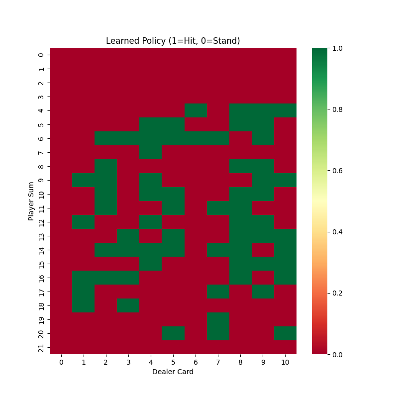 As the diagram shows, based on the states of the player and the dealer, the learned policy suggests that we should stand in most cases when the player's hand value is between 19 and 21.