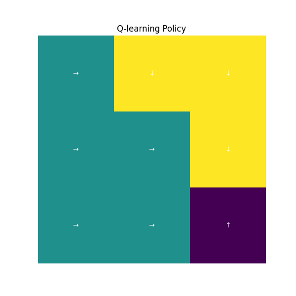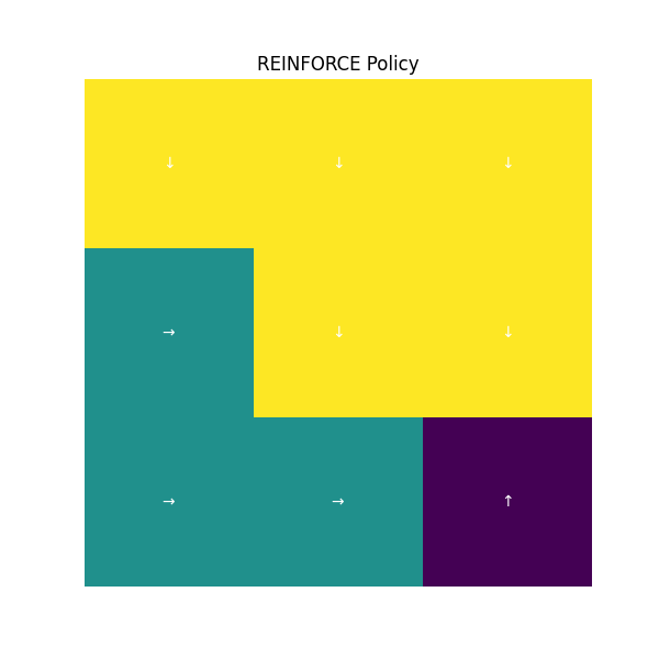Obviously, both approaches perform well in this grid-world task. However, we observe that the value-based method converges faster than the policy-based one. This is because the value-based approach leverages immediate feedback and doesn't require sampling entire trajectories. On the other hand, the policy-based method (e.g., REINFORCE) adjusts action probabilities directly, which allows for more flexible exploration of diverse paths. This characteristic makes it naturally more compatible with deep neural networks. Finally, the learned policies guide the agent as follows:
